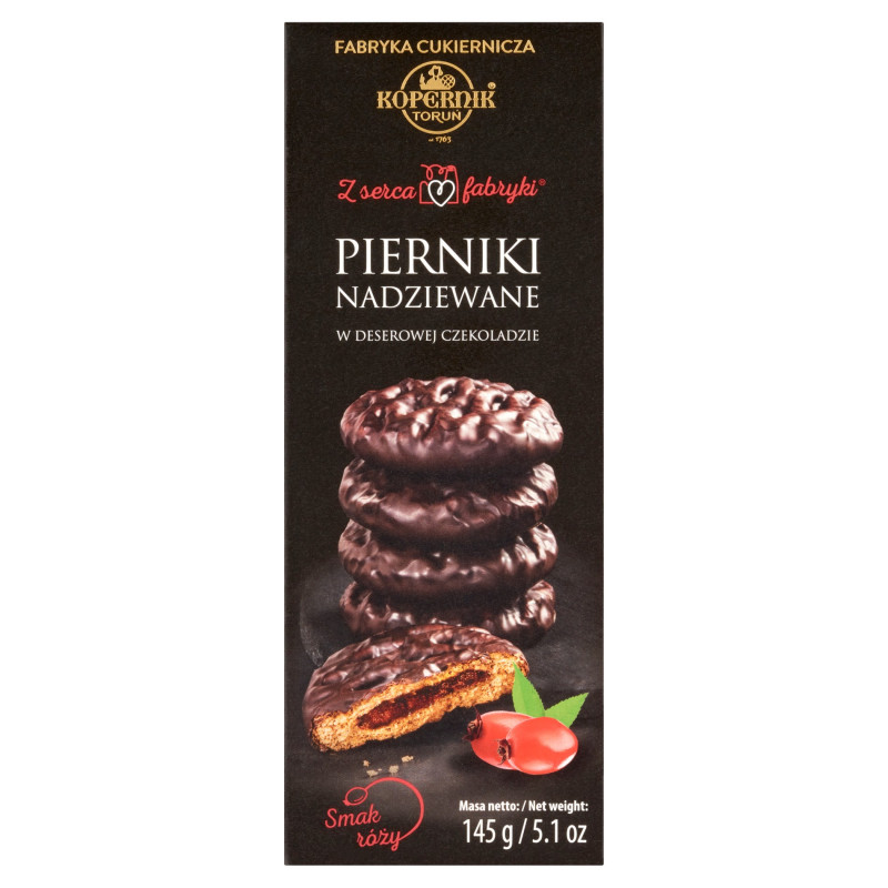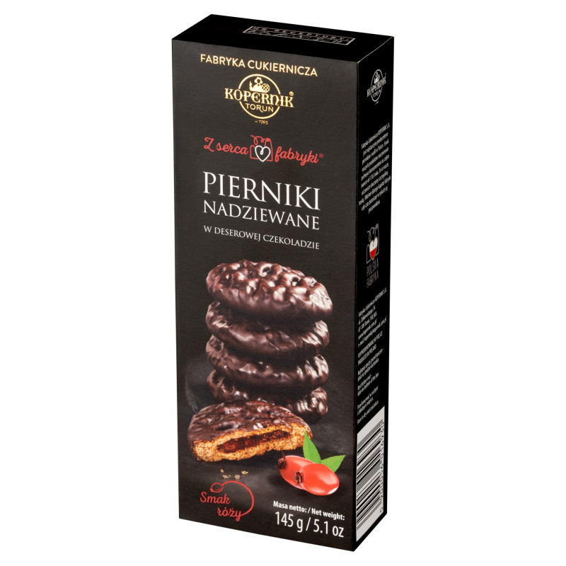 Pierniki w czekoladzie z nadzieniem o smaku różanym.