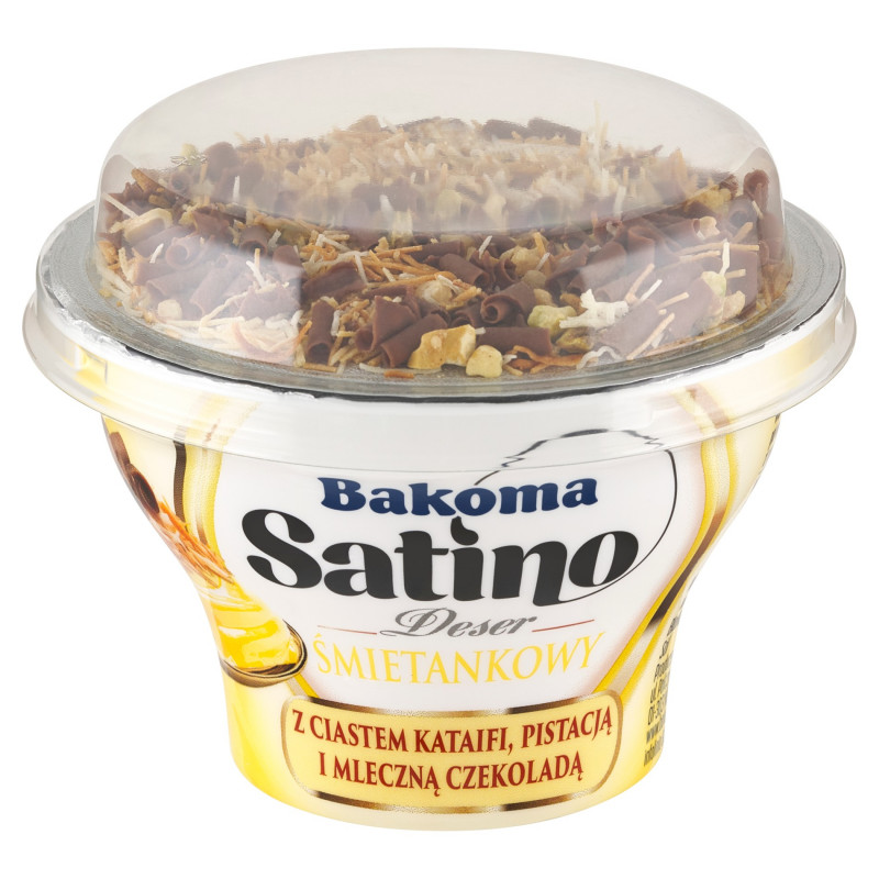 Deser śmietankowy z oddzielnie pakowanym ciastem kataifi, pistacją i mleczną czekoladą.