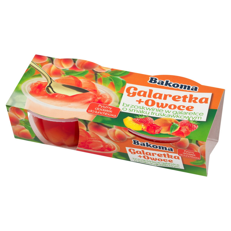 Brzoskwinie pokrojone w kostkę w galaretce o smaku truskawkowym.