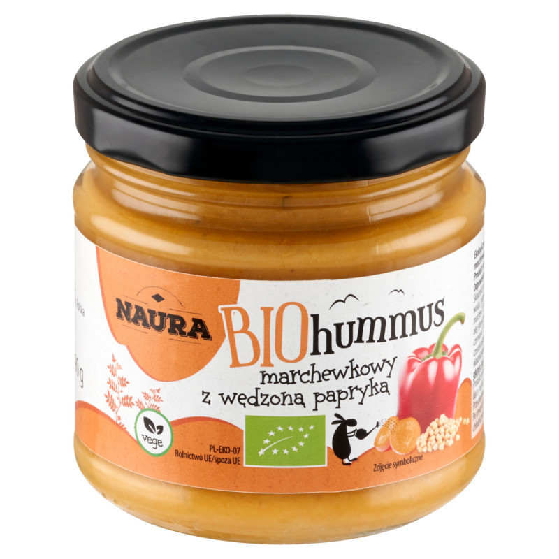 BIO Hummus marchewkowy z wędzoną papryką od Naury to pyszna pasta przygotowana na bazie ciecierzycy. Niepowtarzalnego smaku nadaje dodatek marchewki oraz naturalnych przypraw - wędzonej czerwonej papryki oraz czosnku. Wszystkie składniki pochodzą z kontrolowanych upraw ekologicznych. Ponieważ pasta jest w 100% pochodzenia roślinnego stanowi świetnie smarowidło do pieczywa dla wegan i wegetarian. Idealnie sprawdzi się również jako dip do świeżych warzyw czy farsz do naleśników. Nie zawiera sztucznych dodatków, konserwantów i ulepszaczy smaku.