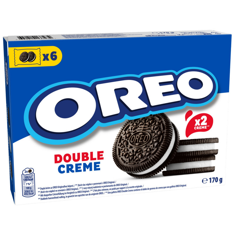 Oreo Double Creme to kakaowe ciasteczka połączone niezwykle grubą warstwą nadzienia Podwójna dawka nadzienia o smaku waniliowym (45%) w porównaniu do Oreo Original. Wyprodukowane tylko z najlepszych składników, które gwarantują niepowtarzalne doznania smakowe. Dostępne w poręcznym opakowaniu, zawierającym dwa ciasteczka Oreo, dzięki czemu mogą być z Tobą gdziekolwiek jesteś. Dodatkowa zawartość waniliowego nadzienia sprawia, że Oreo Double Creme czynią Twoje desery jeszcze bardziej słodkimi oraz aromatycznymi. Zamocz Oreo Double Creme w mleku i przekonaj się jak podwójne nadzienie wpływa na ich smak!