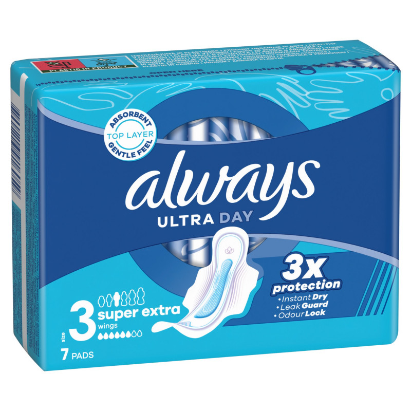 Wybierz odpowiednie rozwiązanie dla siebie, takie jak potrójna ochrona, którą zapewniają podpaski ALWAYS Ultra Super Extra (rozmiar 3). Podpaski Always z chłonną i delikatną powłoczką wchłaniają wilgoć w kilka sekund dzięki technologii InstantDry, a za sprawą technologii LeakGuard i OdorLock zapobiegają przeciekaniu i nieprzyjemnemu zapachowi. Wyjątkowe skrzydełka ComfortLock zaprojektowano tak, by zapewnić doskonałe dopasowanie do każdego rodzaju bielizny. Dla dodatkowej ochrony w nocy wypróbuj podpaski Always Night w różnych rozmiarach. Podpaski Always Ultra zostały zatwierdzone dermatologicznie przez Skin Health Alliance.