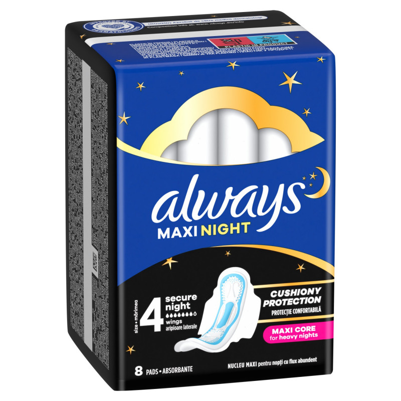 Śpij spokojnie dzięki podpaskom ze skrzydełkami Always Maxi Profresh Night (Rozmiar 4). Zaprojektowane specjalnie z myślą o obfitym krwawieniu podpaski z ultrachłonnym wkładem zapewniają doskonałą, zaawansowaną ochronę przed przeciekaniem. Miękka powłoczka zapewnia maksymalny komfort noszenia, a grubsza konstrukcja zapewnia poczucie pewności siebie i ochronę przez całą noc.