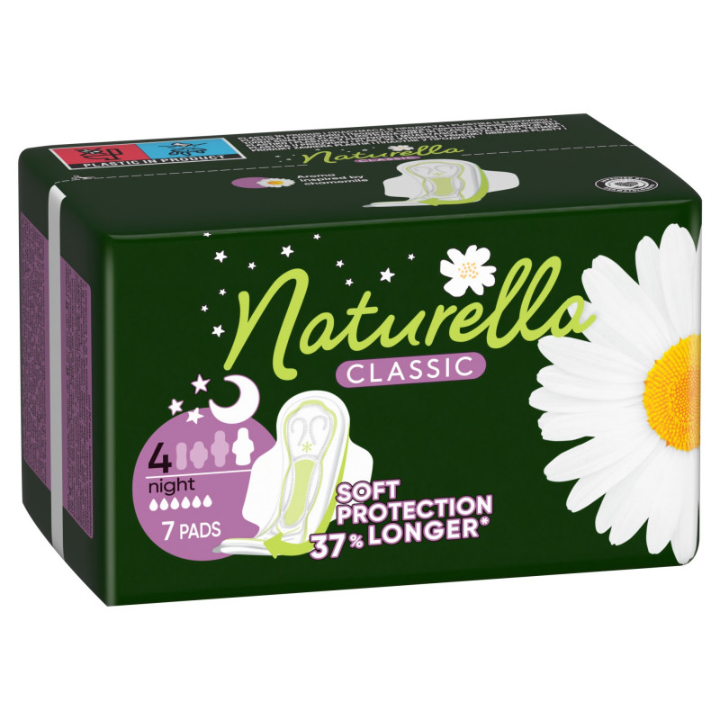 Podpaski na noc Naturella Classic Night są o 37% dłuższe*, aby zapewnić lepszą ochronę w nocy * w porównaniu z podpaskami Naturella Classic Normal