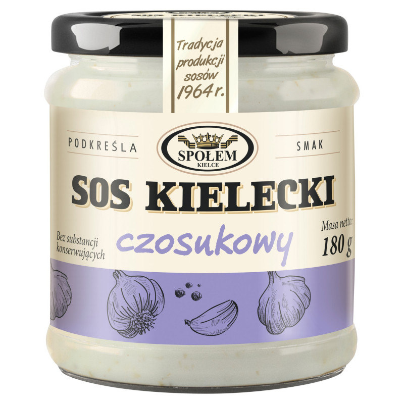 Sos Kielecki czosnkowy o wyrazistym, aromatycznym smaku. Pasteryzowany.