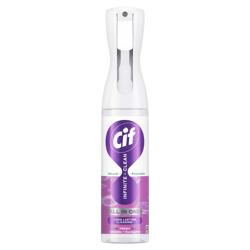 Cif Infinite Clean Uniwersalny Spray Fresh Lavender + Eucalyptus – Twoje codzienne sprzątanie na nowym poziomie! Poznaj innowacyjny środek czyszczący, który łączy skuteczność tradycyjnych detergentów z dobroczynnym działaniem naturalnych probiotyków. Idealny do codziennego czyszczenia różnego rodzaju powierzchni, zapewnia higieniczną czystość i świeżość w Twoim domu. Wszechstronne zastosowanie uniwersalnego sprayu Cif sprawdzi się wszędzie – w kuchni, łazience, a nawet na zewnątrz! Doskonale czyści: • Płyty kuchenne • Lustra i szkło • Blaty • Krany • Urządzenia elektroniczne • Półki na książki • Rowery • Płytki • Przestrzenie, w których przebywają Twoi najbliżsi i zwierzęta domowe** To wciąż nie wszystko. Przedłużone dzięki naturalnym probiotykom działanie, ułatwia usuwanie zanieczyszczeń, zapewniając czystość na powierzchniach nawet do 3 dni*! Dzięki temu Cif Infinite Clean nie tylko czyści, ale i dba o Twoje otoczenie, zapewniając długotrwałą świeżość. Ten uniwersalny spray jest wyjątkowo łatwy w użyciu. Został umieszczony w wygodnej butelce z rozpylaczem, dzięki czemu czyszczenie jest szybkie i bezproblemowe. Wystarczy wstrząsnąć butelką, spryskać powierzchnię, przetrzeć i cieszyć się efektem mgiełki, która dociera nawet do trudno dostępnych miejsc. Ze względu na bezpieczeństwo, podczas czyszczenia sprzętu elektronicznego najpierw nanieś produkt na ściereczkę, a następnie delikatnie przetrzyj powierzchnię urządzenia, wcześniej odłączonego od prądu. Aby odświeżyć miękkie powierzchnie, takie jak tapicerki, rozpyl niewielką ilość produktu z odległości i pozostaw do wyschnięcia. Jeśli nieskazitelna czystość, higiena i kompleksowa pielęgnacja to coś, o co chcesz zadbać w swoim domu, koniecznie wypróbuj także inne produkty marki Cif, takie jak mleczko kuchenne, odtłuszczacz czy odkamieniacz. Zadbaj razem z Cif o czystą i bezpieczną przyszłość! * Efekt działania probiotyków na twardych powierzchniach nawet do 3 dni. ** Koty i psy.