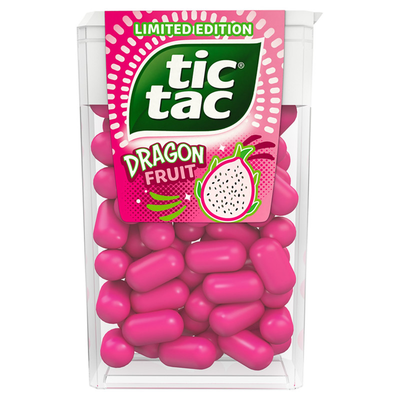 Tic Tac® Dragon Fruit o smaku smoczego owocu to coś dla tych, którzy lubią nowe doświadczenia. Egzotyczny i zaskakująco łagodny. Niecodzienny smak w większym opakowaniu, który zostaje w pamięci.
