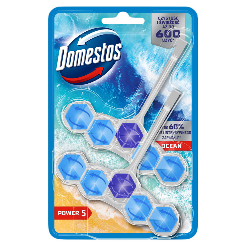 - Ponadto kostki do WC Domestos Power 5 Ocean uwalniają do 60% bardziej intensywny i długotrwały zapach w porównaniu do poprzednich wersji produktu