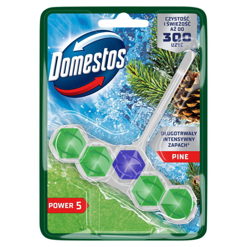- Kostki toaletowe Domestos Power 5 Pine zapewniają higieniczną czystość i świeżość w toalecie aż do 300 spłukań