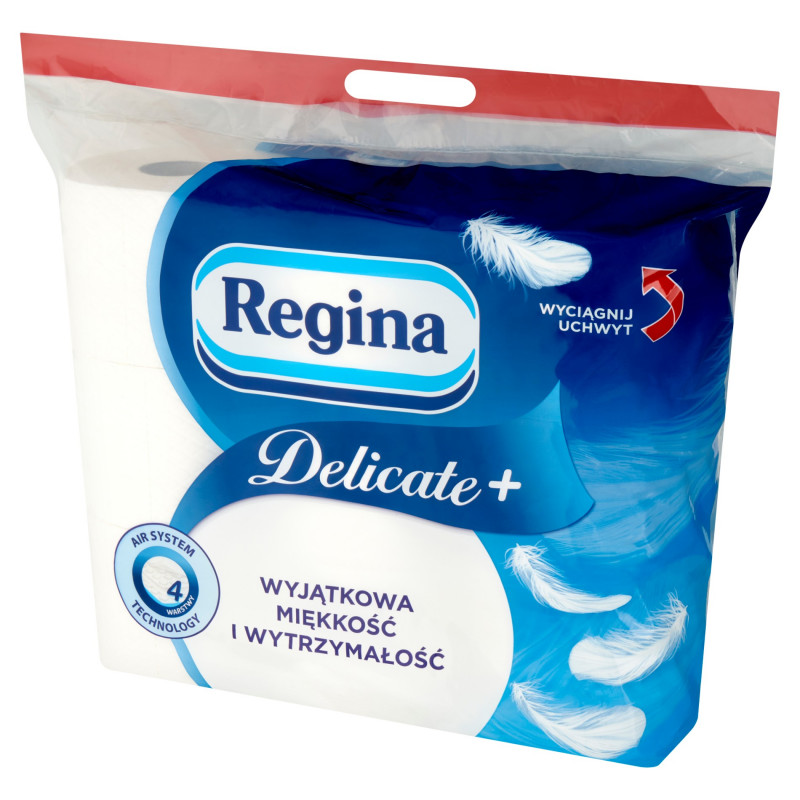 Air system Technology. Unikatowy system „poduszeczek powietrznych", który sprawia, że połączone ze sobą cztery warstwy papieru tworzą maleńkie komory wypełnione powietrzem, dzięki którym papier Delicate+ osiąga miękkość, jakiej jeszcze nie doświadczyłeś. Poczuj różnicę. Technologia zastrzeżona dla produktów Regina.