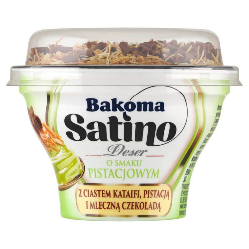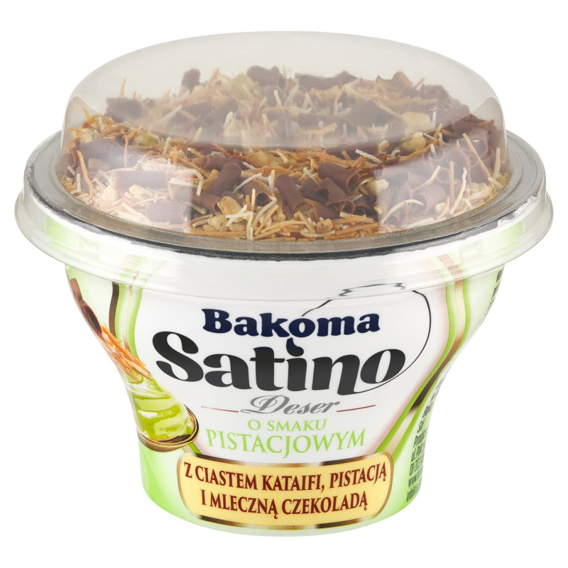 Deser o smaku pistacjowym z oddzielnie pakowanym ciastem kataifi, pistacją i mleczną czekoladą.