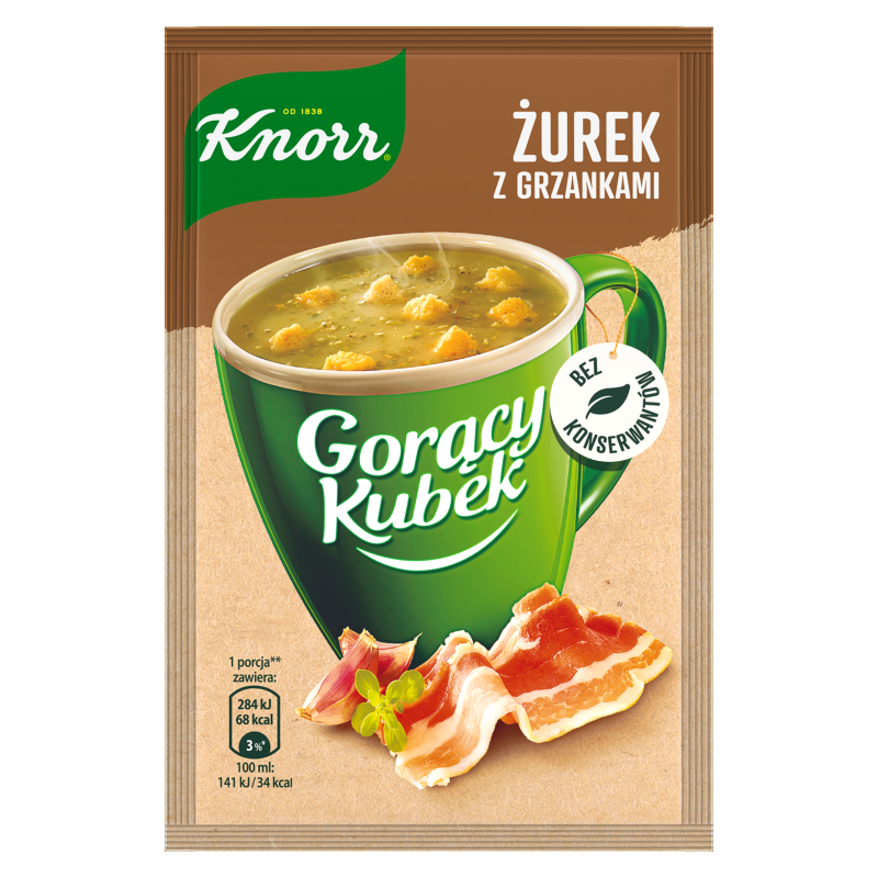 - Zupa błyskawiczna Żurek z grzankami Knorr Gorący Kubek bez konserwantów to idealna, rozgrzewająca przekąska dla zabieganych, którą możesz łatwo i szybko przygotować